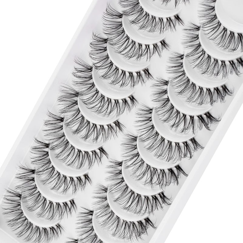 - 1 High Quality 3d false eyelashes: Made of superior synthetic fibers material. We adopt the advanced ultra thin 0.05mm thickness synthetic fibers updated with a silky-soft finish.Russian false eyelashes look like Lashes Exension - Natural look daily eyelashes 10 pairs wispy clear band lashes pack.The eyelashes give you a natural fluffy look,make your eyes more beautiful.