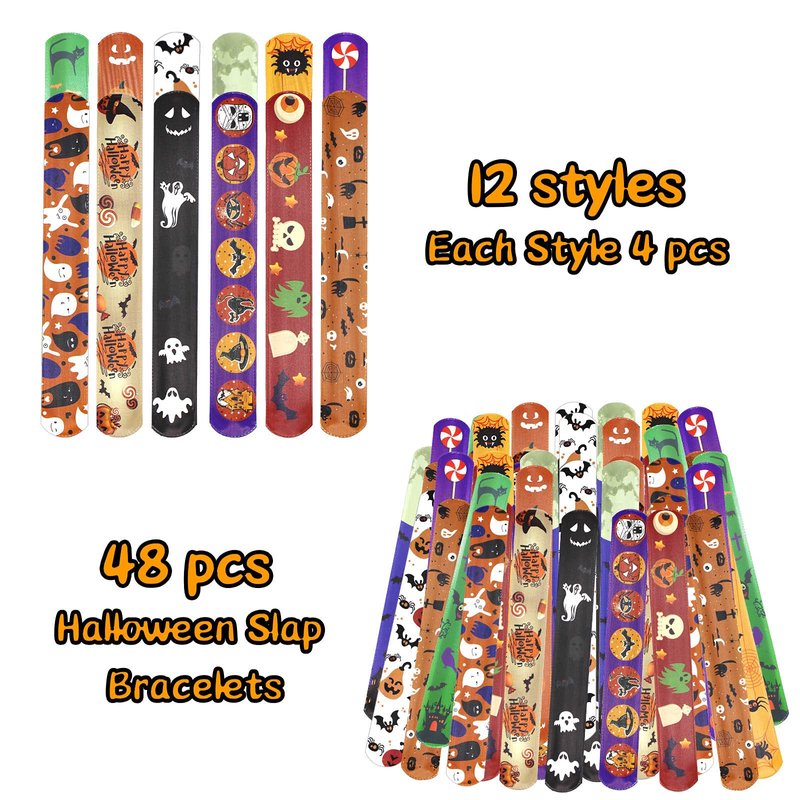 - 【A Variety of Styles】Our Halloween slap bracelets for kids have various styles. 48 pcs Halloween slap bracelets in 12 different patterns not only make your Halloween more colorful and vivid, but also meet your different needs according to your preferences. Moreover, these cute patterns are all Halloween classic elements - pumpkins, ghosts, cats, skulls and spiders, etc. The slap bracelets for Halloween dressing up costume will create an intense festival atmosphere.