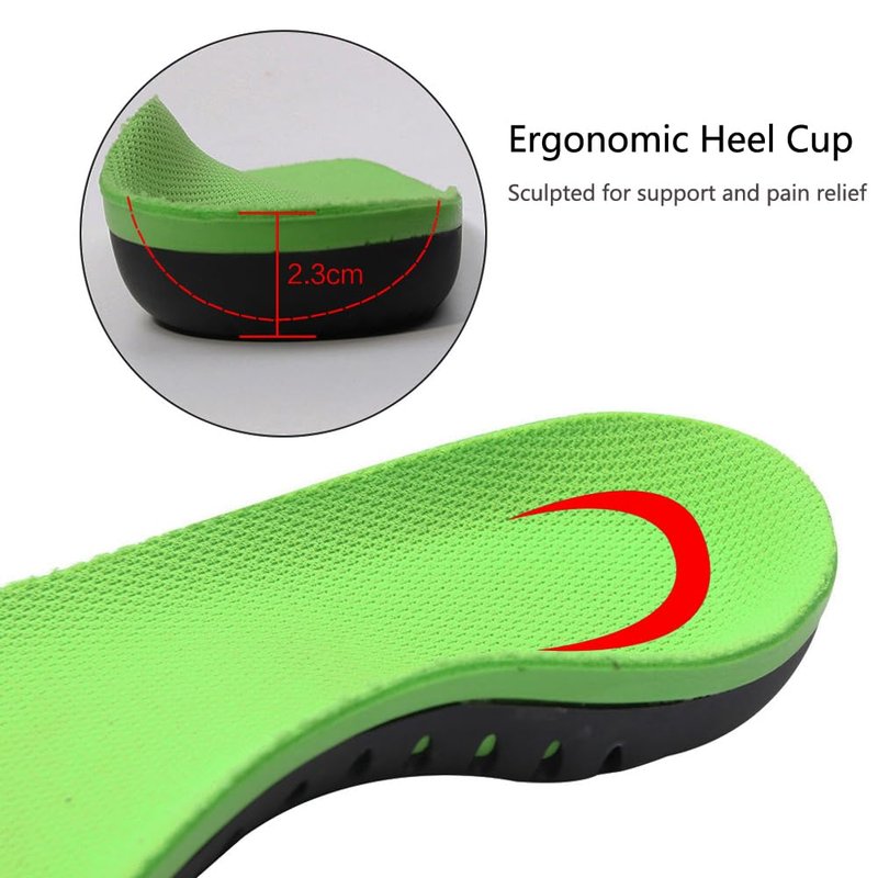 - High Arch support-If you are suffer from plantar fasciitis,flat feet,fallen arch&low arch or high arch, then you will need a lot of arch support. Our insoles provide 1.38 inches arch support for high arch, and give a firm and supportive arch for plantar fasciitis,flat feet,fallen arch&low arch. It fits right up into your arch like a good chair against your lower back-Instant pain relief.
