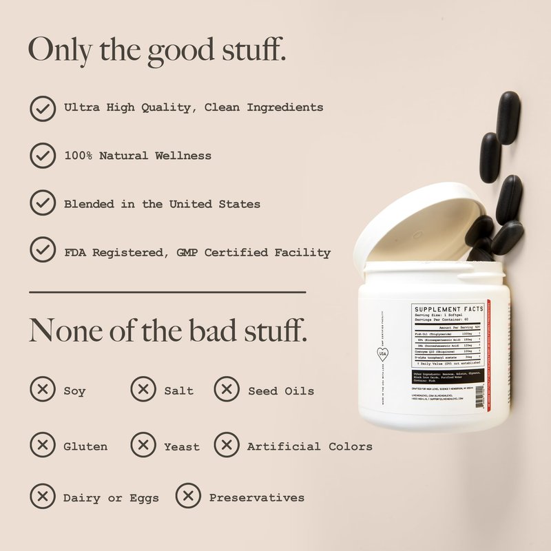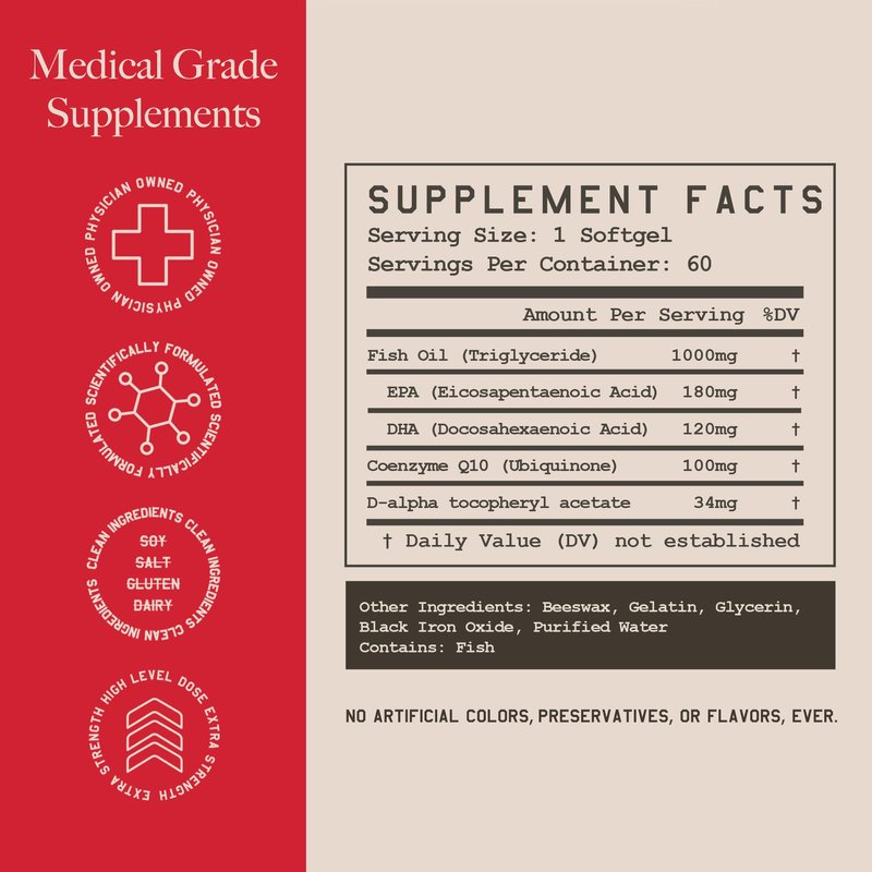 Elevate your wellness routine with a supplement that is rooted in science and crafted with care. Our Heart, Body & Mind formula combines the benefits of Omega 3, CoQ10, and Vitamin E in one convenient softgel. This unique blend is designed to support a wide range of wellness goals, all while adhering to the highest standards of ingredient purity and quality. Each softgel is formulated with 1000 mg of Omega 3, 100 mg of CoQ10, and 34 mg of Vitamin E, providing a powerful combination of ingredients. We source our fish oil from wild caught Chilean fish, helping to ensure that each ingredient is selected for its efficacy and purity. Unlike other supplements, ours is made without artificial colors, preservatives, or fillers, and it is free from common allergens and unwanted additives like soy, salt, gluten, dairy, seed oils, yeast, and artificial colors. Our commitment to quality extends beyond our ingredients. This supplement is blended and made in America, adhering to strict standards of manufacturing. Designed for those who seek a comprehensive approach to wellness, this supplement offers an easy, consistent, convenient way to integrate key nutrients into your daily routine that can help provide body, heart and cognitive function support. Discover the difference with a supplement crafted by experts and backed by science, made to fit seamlessly into your life.