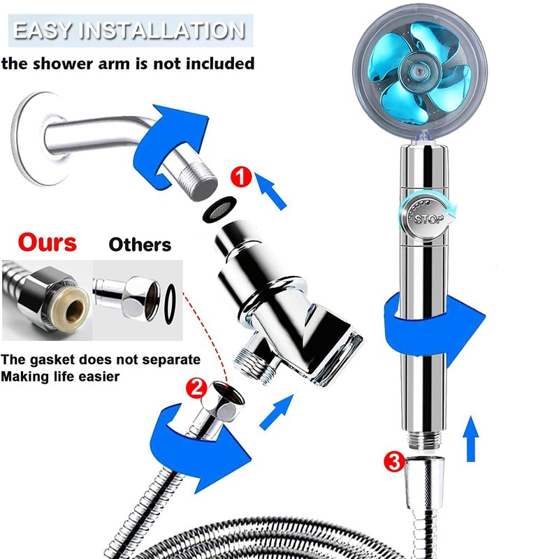 - [360 Degrees Free Rotation + Adjustable] This RV shower head is made of high-quality ABS and stainless-steel panel. Swivel neck and 360° rotatable head design can meet your different needs at any angle. The Turbo shower head has an independent pause switch + a button to adjust the water size. It's more convenient to turn on or turn off the water when you use our propeller shower head, the vortex shower heads to save water at the same time