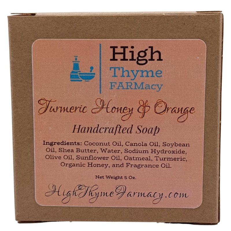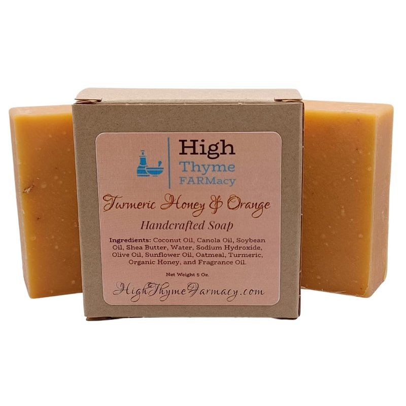 - High Thyme FARMacy's Turmeric Honey & Orange Soap features an aromatic blend of turmeric, honey & orange with a hint of spicy ginger. Our natural bar soap is a perfect addition to your daily routine.