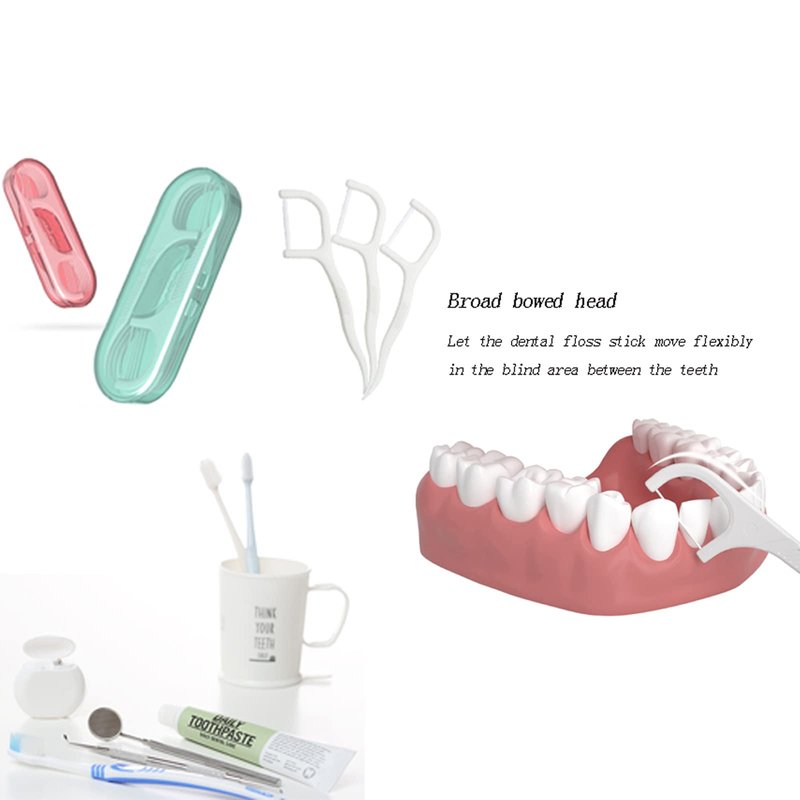 Package contents:20pcs dental floss with 2 portable case Portable case size:82mm*34mm Toothpick:75mm(H) Color:Pink or green The handle design is located at the golden point of the floss, and the middle part adopts a convex design to enhance the hand feeling and save effort and protect the teeth. STEPS FOR USAGE: STEP 1:Move part of the floss around the teeth gap, then slide into the teeth slowly. STEP 2:Put the floss into one side of the tooth closely, gently pull up and down the floss to clean the adjacent teeth. STEP 3:When encounter a large residue, the other side of flodss can be used for clean. Children and the elderly can use it.
