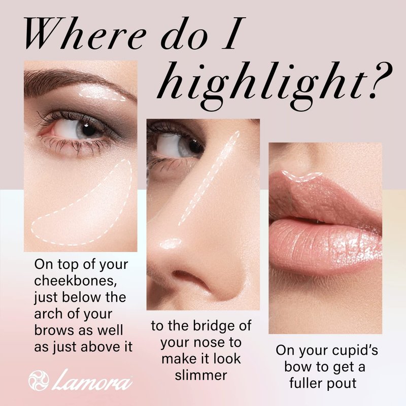 - VEGAN & CRUELTY FREE - makeup highlighter for strobing. Apply face highlighter based on the level of glow you want using Lamora beauty sponge or Lamora fan, tapered or stippling brush.
