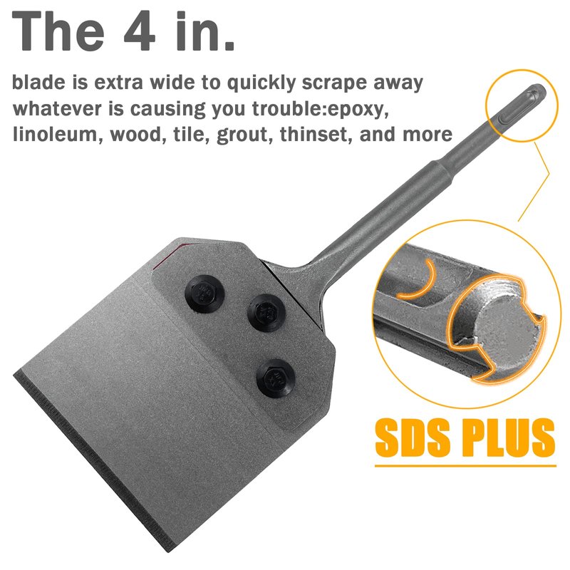 - 【Wide Application】: HIGOSPRO 4 Inch SDS Plus Floor Scraper works great for scrapeing job, like removing Ceramic Tile, Thinset, Carpet, Epoxy, Vinyl and other dried stubborn adhesives removal, also in removing the glued down wood floors and hardwood floor.