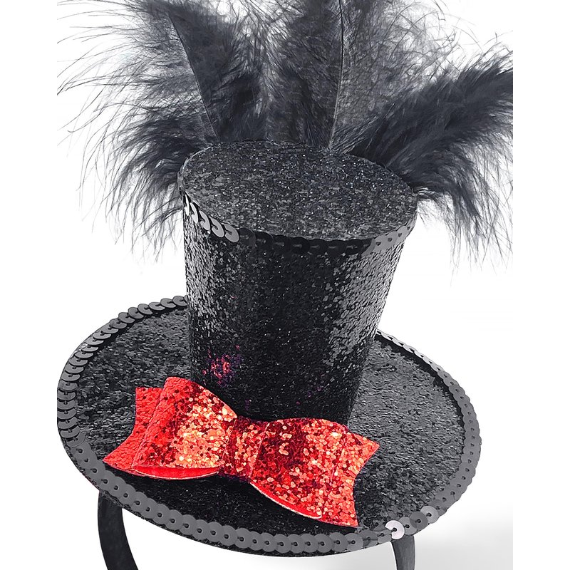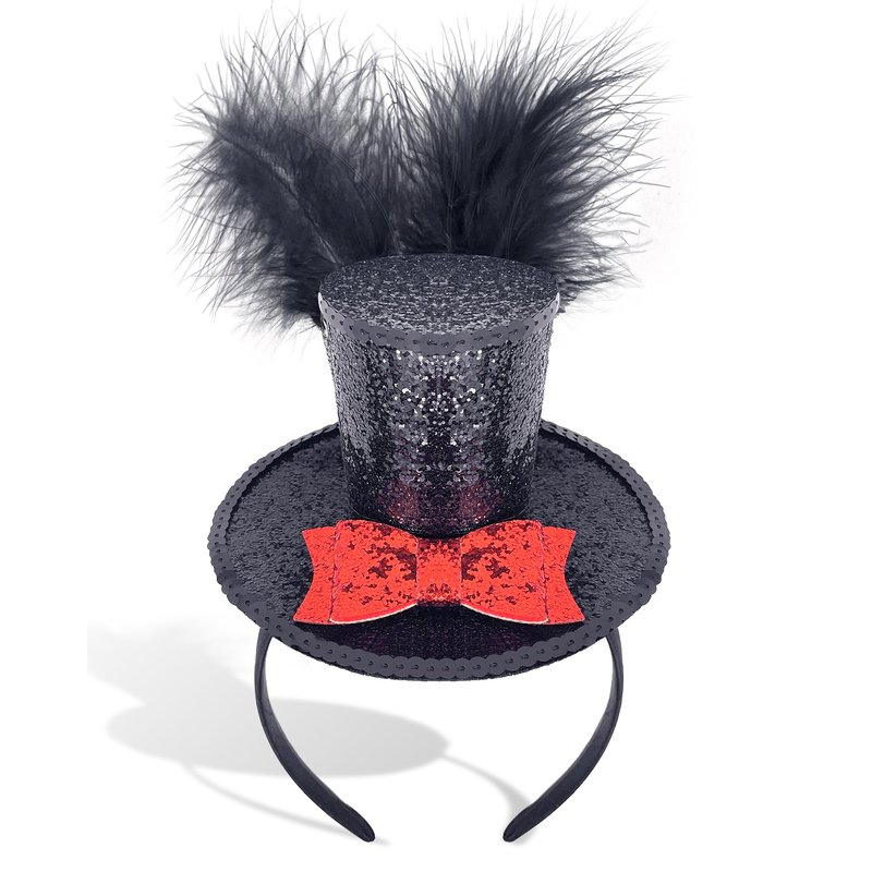 - [Mini Top Hat Style] Multi-colored feathers and a mini top hat on a lightweight headband. Very cute headband decoration, black mini hat, novel bright pink bow design. Brighten up your Halloween party with this shiny, sequined little top hat headband!