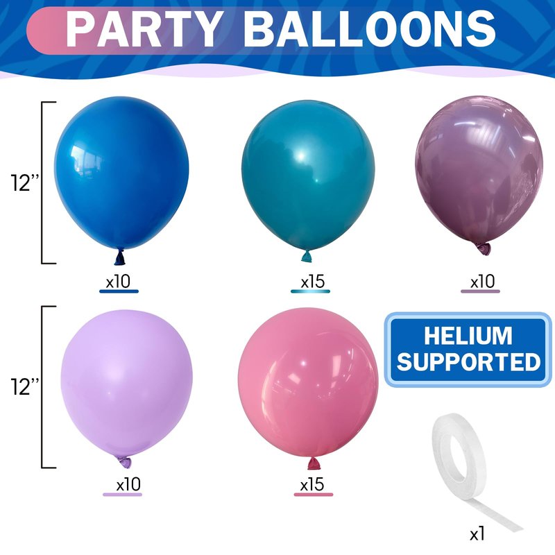 - Royal Blue Purple Balloons: Includes dark blue balloons (12 in; 10 pcs ); turquoise balloons (12 in; 15 pcs ); dusty purple balloons (12 in; 10 pcs ); pastel pink balloon (12 in; 15 pcs ); pastel purple helium balloons(12 in; 10 pcs ) and a roll white ribbon; This balloons blue violet purple pink can add a unique atmosphere to your end of summer party decorations