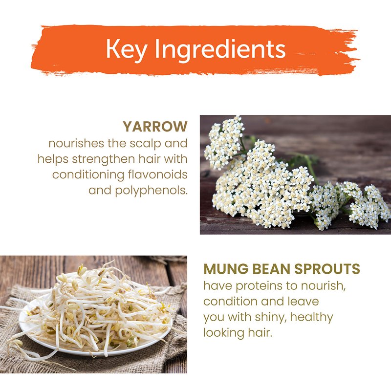 - WITH YARROW AND BEAN SPROUT: Yarrow is a traditional Ayurvedic ingredient for conditioning and moisturizing and Mung Bean Sprouts are a rich source of protein.