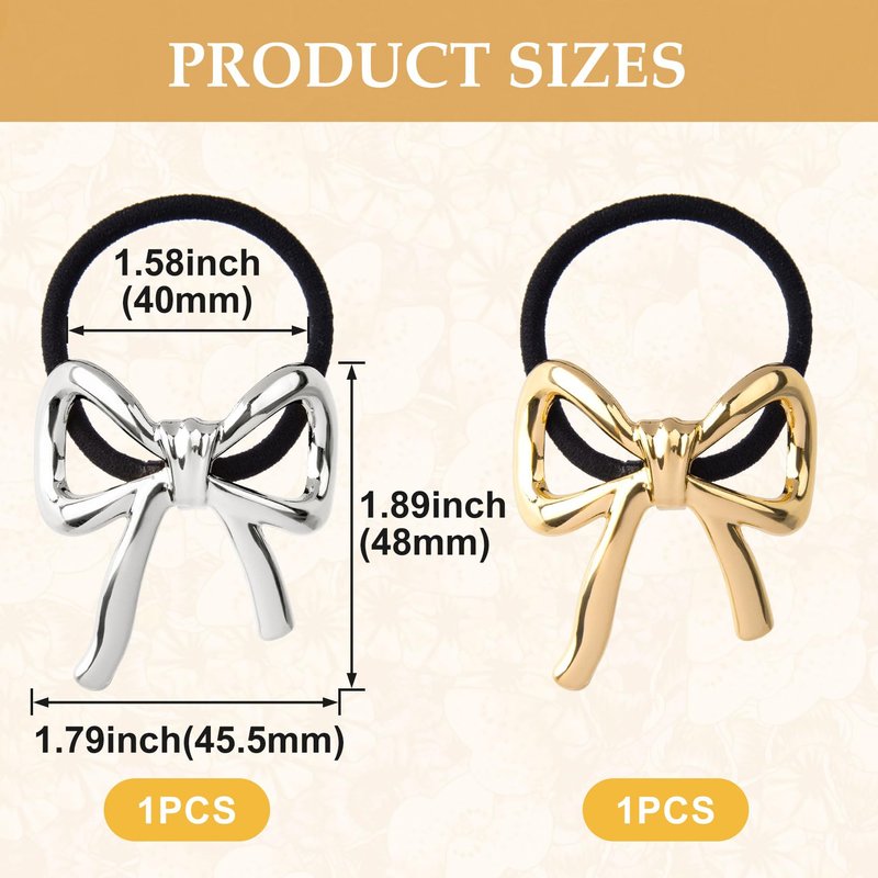 - Package Included: 2 pcs of bow hair ties for gold silver, each color has 1 pcs. Adorable bowknot and elegant color will attract everyone's eyesight. Bowknot is 1.89x1.79inch/48x45.5cm, inner diameter of rubber is 1.58inch/40mm.