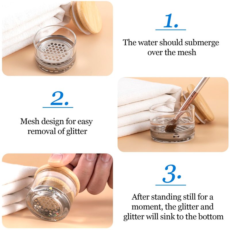 - How to Use: Pour the pen wash water into the cup until the water is just over the mesh, dip the brush into the pen wash water, rub it on the filter net, the glitter on the brush will sink into the mesh, not affect the next brush wash, so you don't need to change the pen wash frequently.