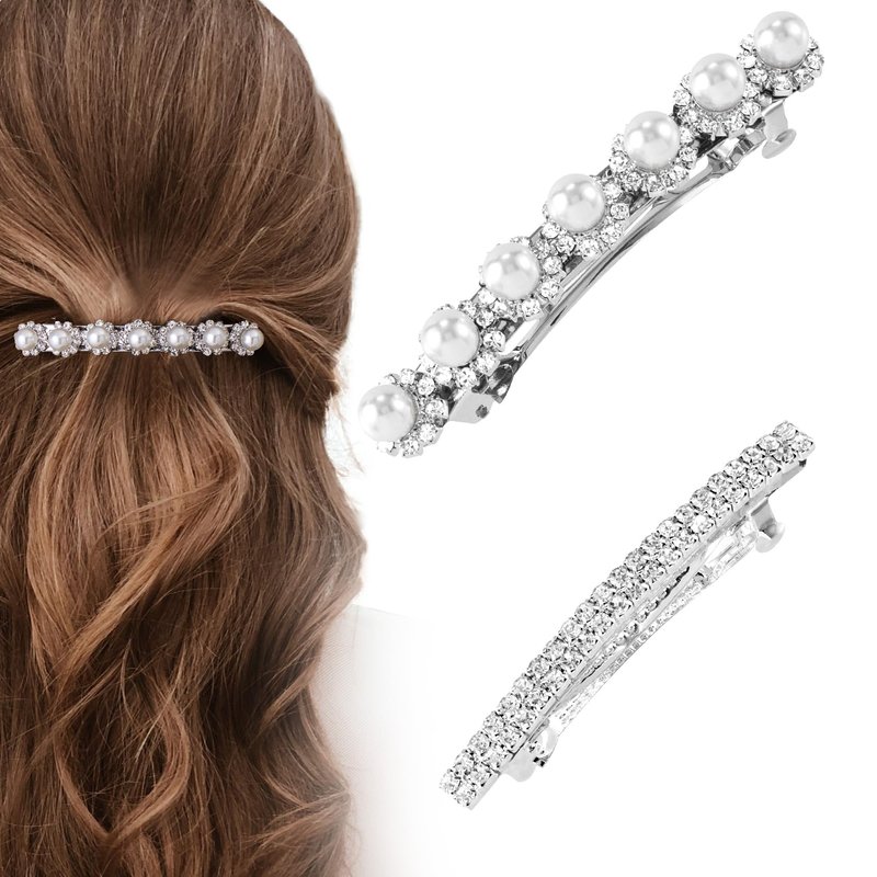 HINZIC 2Pcs Sparkly Rhinestone Hair Clips, Silver Pearl Barrettes Crystal French Hair Pins Wedding Prom Engagement Dressy Decorative Accessories for Women Girls Bride