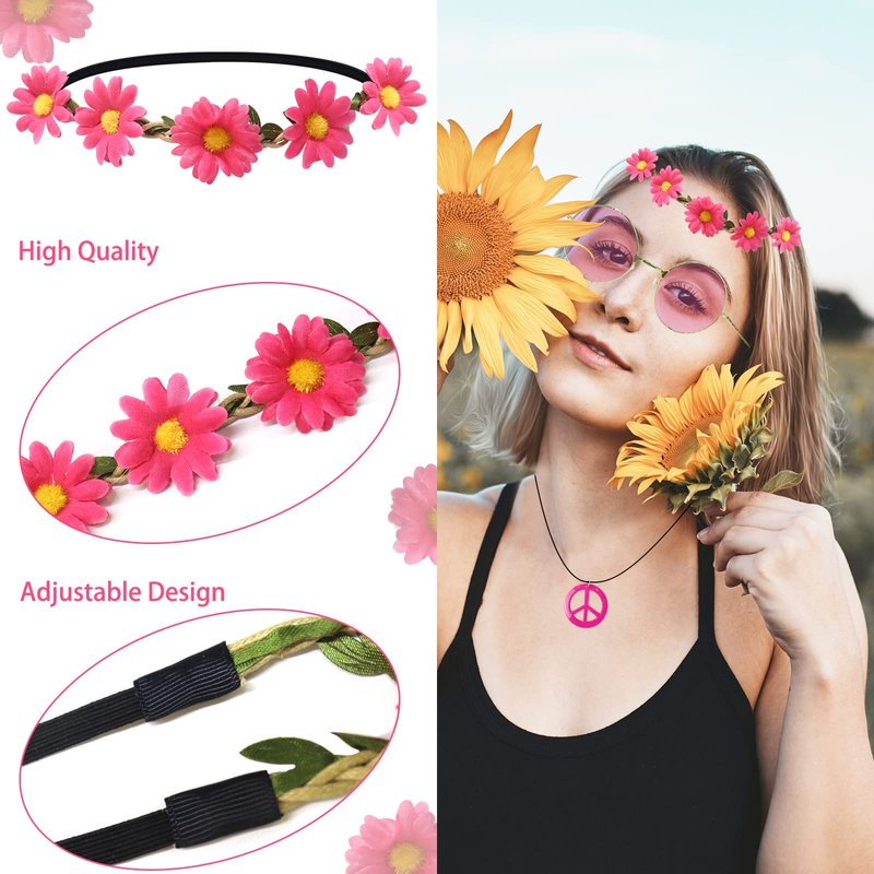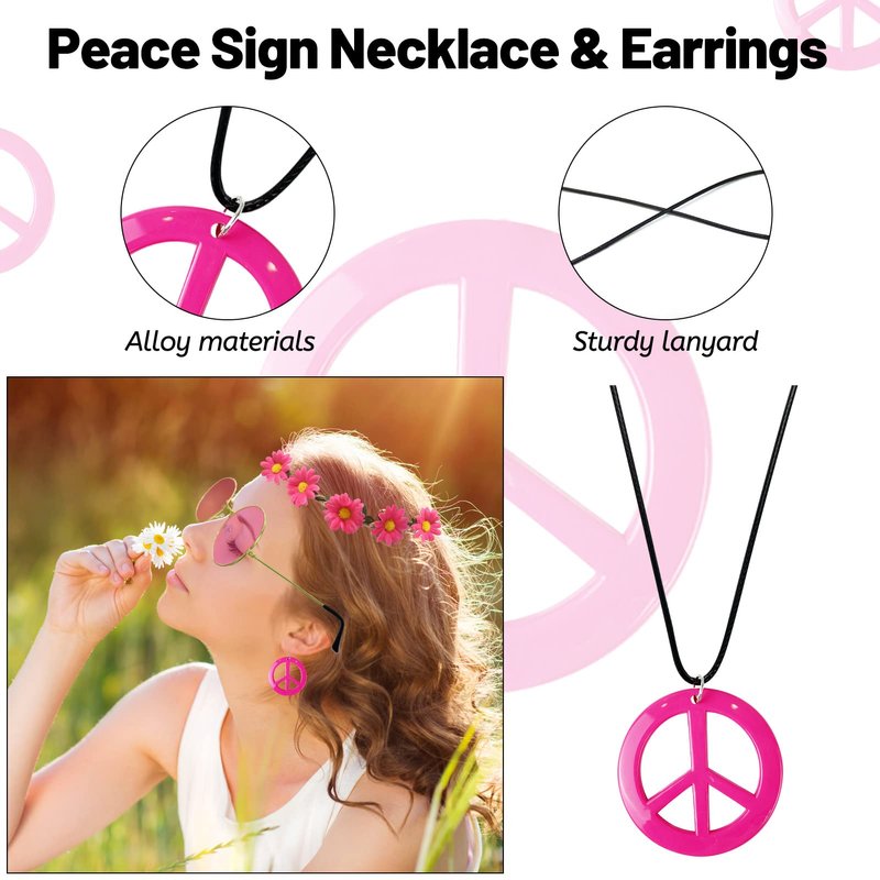 - đ¸ăHippie Accessories for Womenă4 pieces fashion hippie accessories in a package, 1 pair of hippie glasses, 1 hippie flower crown, 1 pink peace sign necklace, 1 pair of peace sign earrings; unleash your inner hippie spirit with our pink hippy accessories kit, nice 70s accessories to dress up your 60's 70's hippie look. They will bring you new surprises!
