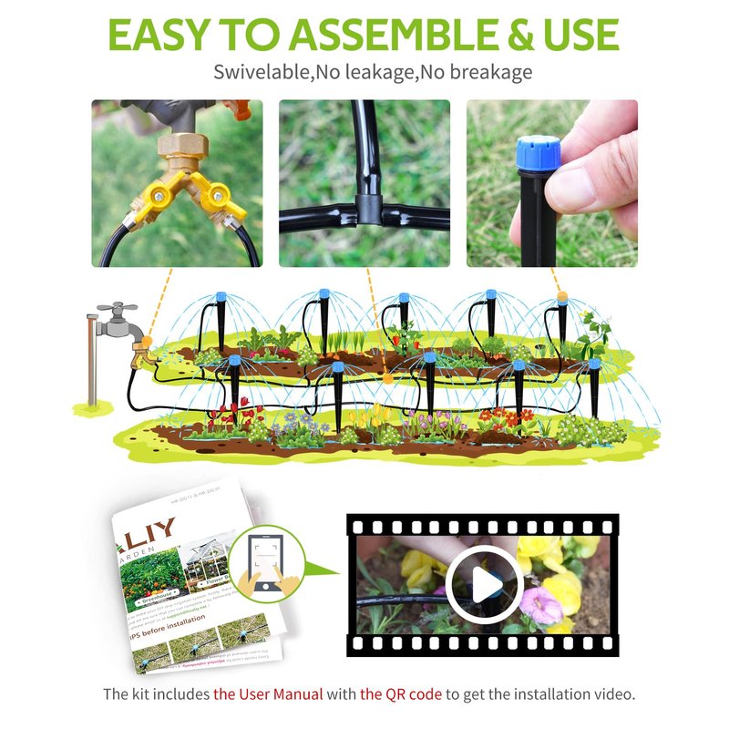 - [Easy To Assemble & Use] Simple installation without digging or plumbing skills, simply insert the fittings and droppers, you can begin watering your plants instantly. The drip system kit includes the User Manual with the QR code to get the installation video.