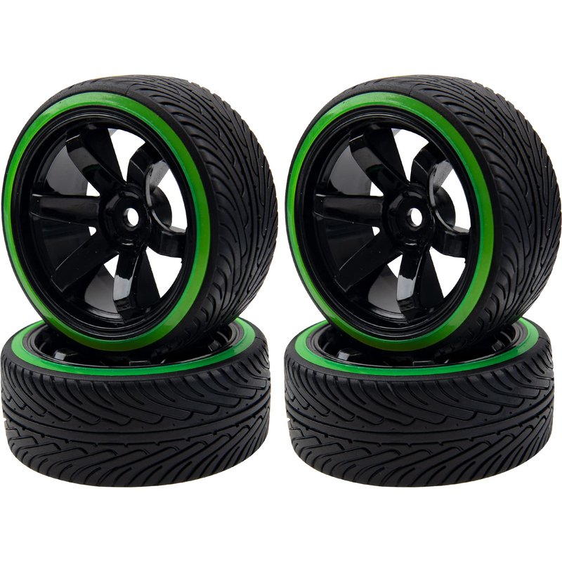 HIRCQOO 1/10 RC Drift Car Tires 12mm Hex Hub Wheel Rims & Hard Plastic Tyre 6 Spoke Compatible with Traxxas HSP Tamiya Kyosho HPI Redcat 1/10 On-Road RC Drift Drifting Car (Green)