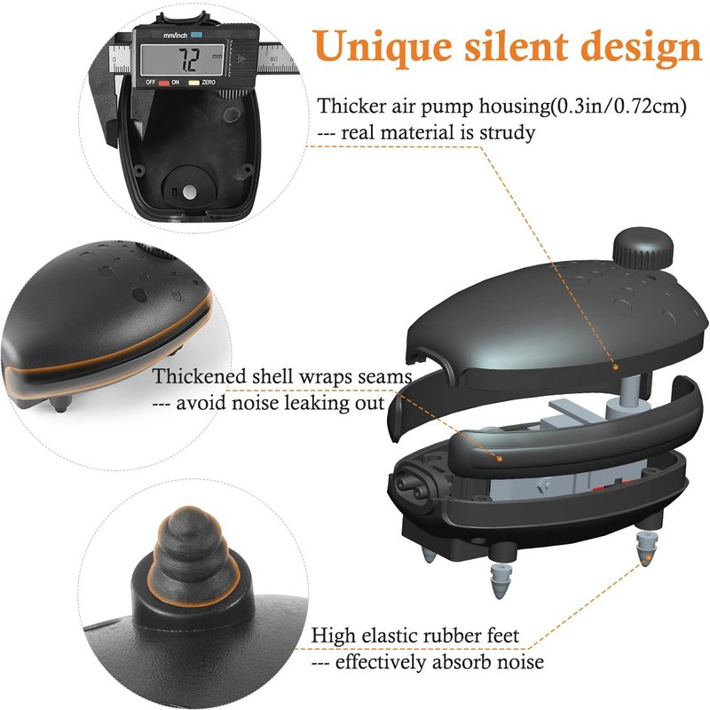 - 【Ultra quiet design】In order to minimize the noise generated when the fish tank air pump is working, we have adopted a double noise reduction design. First, a strip-shaped thickened shell is designed to wrap the side seams to prevent noise leakage. Second, elastic rubber support feet are used to absorb vibration and effectively reduce noise. Even if it is placed in the bedroom, you will not feel noisy.