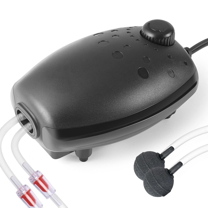 HITOP Ultra Quiet 3W Aquarium Air Pump, 2 Outlets Adjustable Fish Tank Air Pump, 80GPH Aquarium Aerator with Completely Accessories [Compact but powerful] This HITOP Aquarium air pump is only the size of a palm, compact in size, but very powerful. It has dual outlets and can pump 80 gallons of air into the fish tank at maximum power. It is a good choice for oxygenating fish tanks under 120 gallons. Can also be used for small ponds or hydroponics.