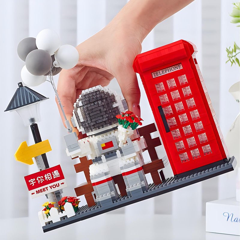 - Unique Design & Exquisite Details: This astronaut figurine stands out with its striking crystal-studded mask, a creative touch holding balloons and flowers, creating a blend of sci-fi charm and heartwarming ambiance. The backdrop of a phone booth under a streetlamp adds a serene and anticipatory air, imbuing the entire piece with narrative depth and artistic flair, making it a star attraction on desks or display cabinets.