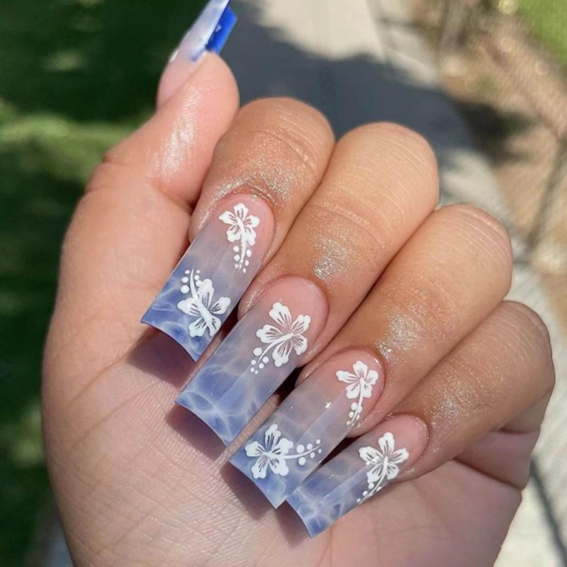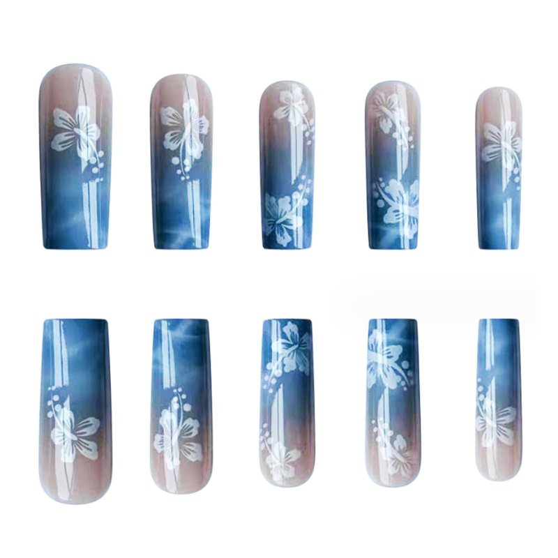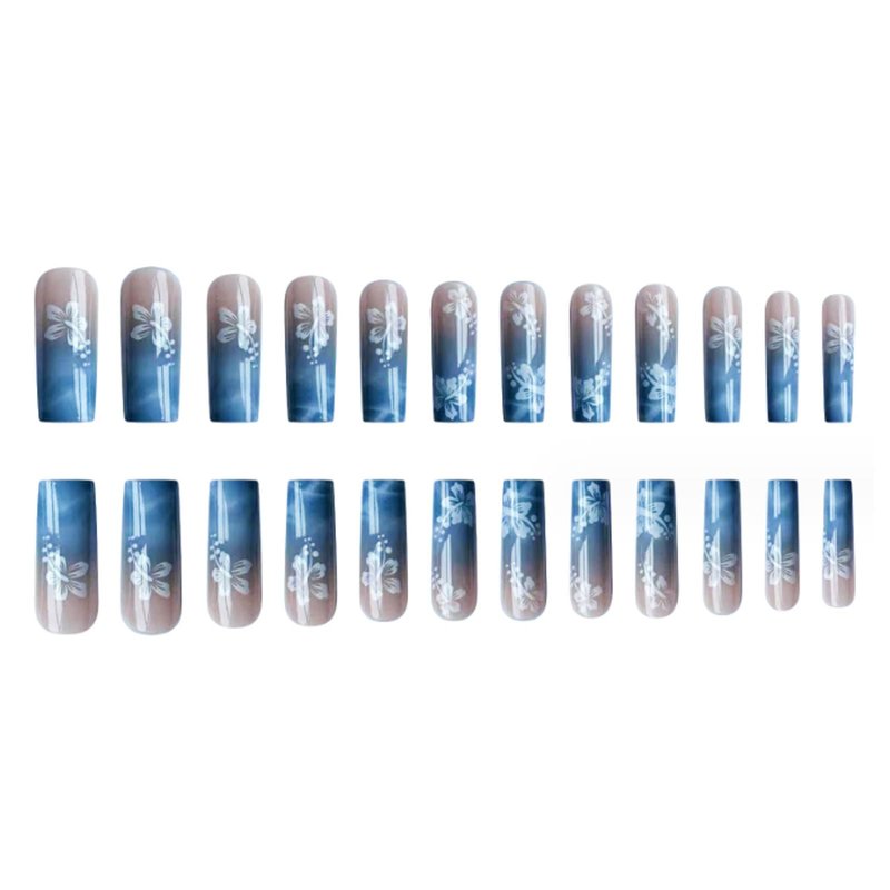 Hkanlre Blue Press on Nails Square Long Fake Nails Tips Full Cover Flower Gradient False Nails for Women and Girls 24PCS