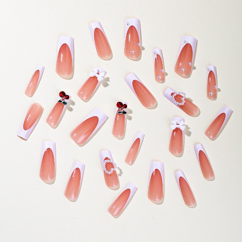Hkanlre Nude Press on Nails Long Cherry Fake Nails Tips Full Cover False Square French Nails for Women and Girls 24PCS