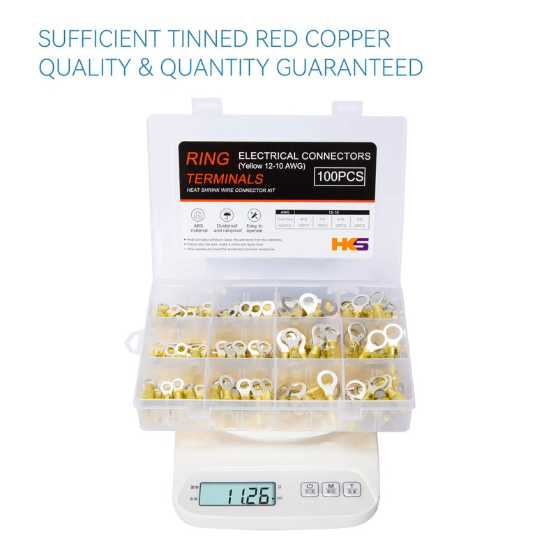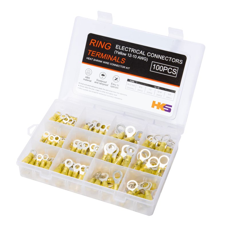 - [Red Copper 100Pcs KIT]There are 100 Pcs heat shrink ring terminals,4 sizes #10,1/4",5/16",3/8" - 25Pcs per size, Yellow - AWG 12-10. Tinned copper barrel ensures a strong wire crimp .Heat Shrink Wire Connector can fully clamp the wires, wire will never slip out of electrical wire terminals crimp connectors.