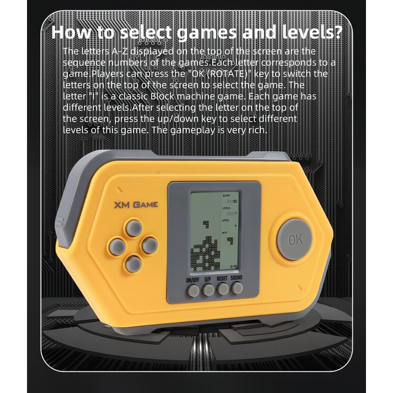 - ★★How to select games and levels?★★The letters A-Z displayed on the top of the screen are the sequence numbers of the games. Each letter corresponds to a game. Players can press the "OK (ROTATE)" key to switch the letters on the top of the screen to select the game. The letter "I" is a classic Block machine game. Each game has different levels. After selecting the letter on the top of the screen, press the up/down key to select different levels of this game. The gameplay is very rich.