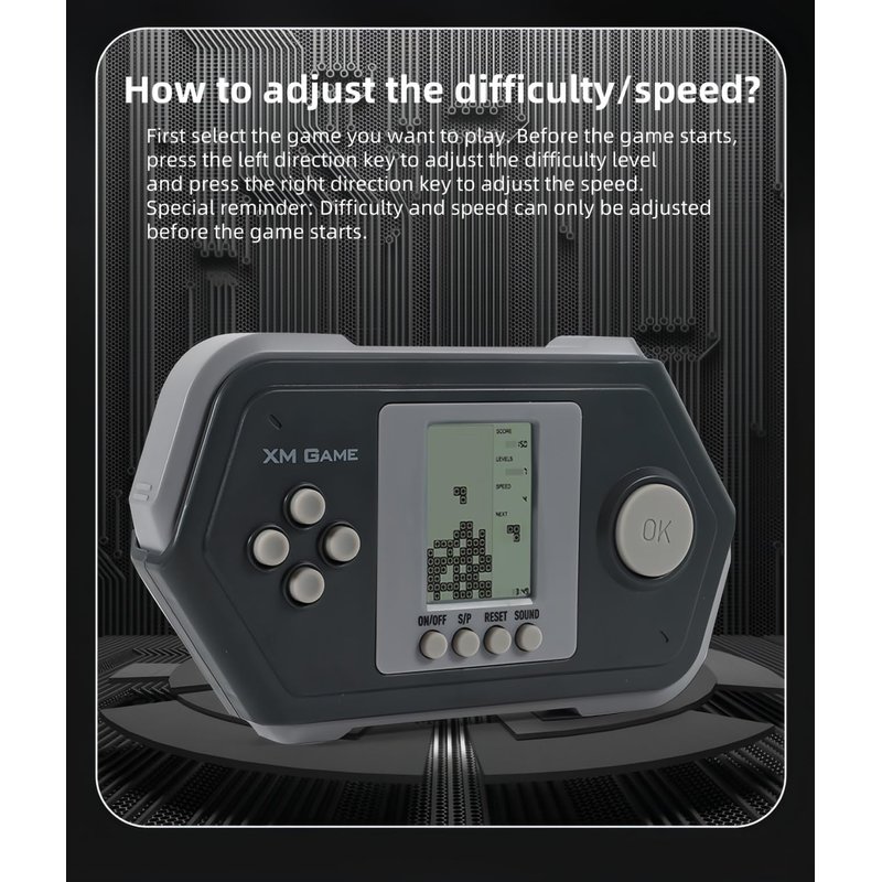- ★★How to adjust the difficulty and speed of the game?★★First select the game you want to play. Before the game starts, press the left direction key to adjust the difficulty level and press the right direction key to adjust the speed. Special reminder: Difficulty and speed can only be adjusted before the game starts.