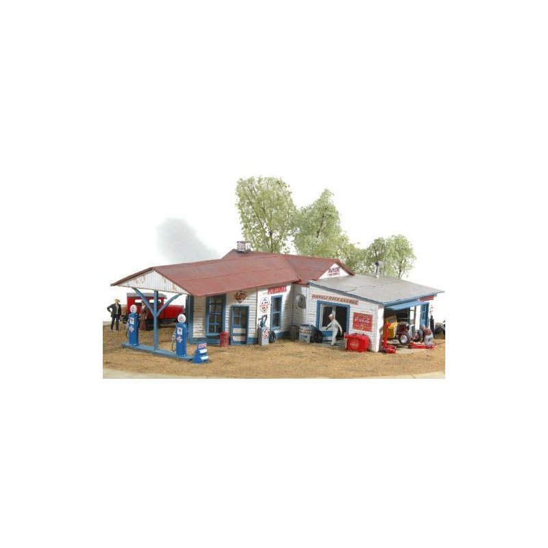 Laser cut basswood walls, injection molded windows and doors, full color Skelly sign sheet and over 20 cast metal details to complete the scene. Foot print 5-3/8" x 7-3/8".