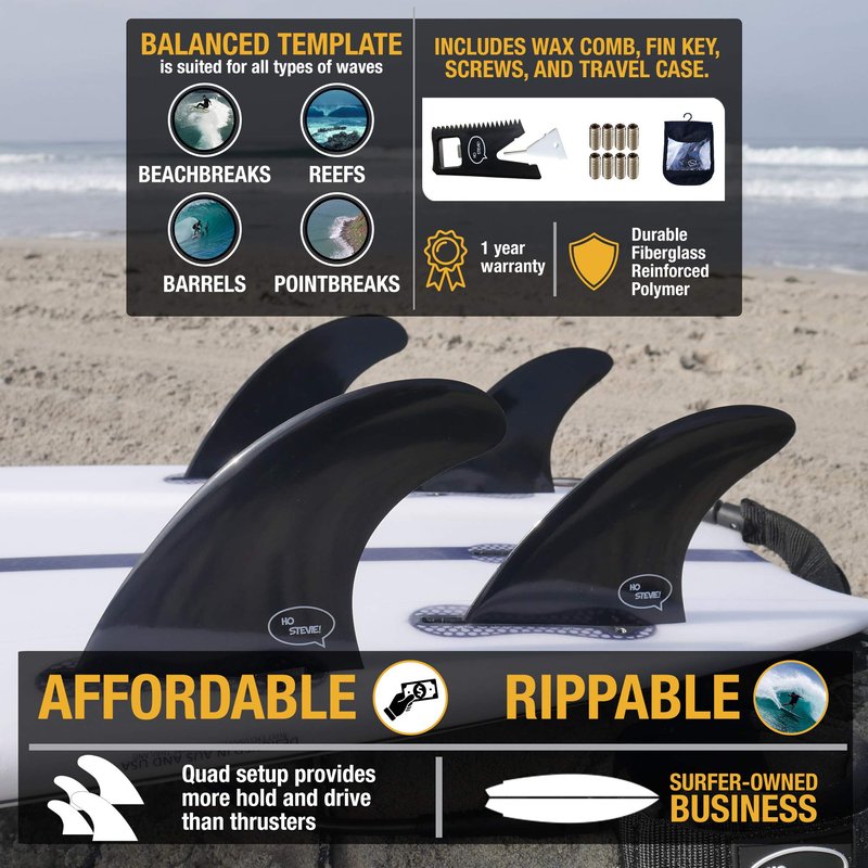 Ho Stevie! FRP Quad (4) Surfboard Fins - Stronger Than Regular Nylon Fins - includes Fin Bag, Screws, Wax Comb and Fin Key (Black, Single Tab)