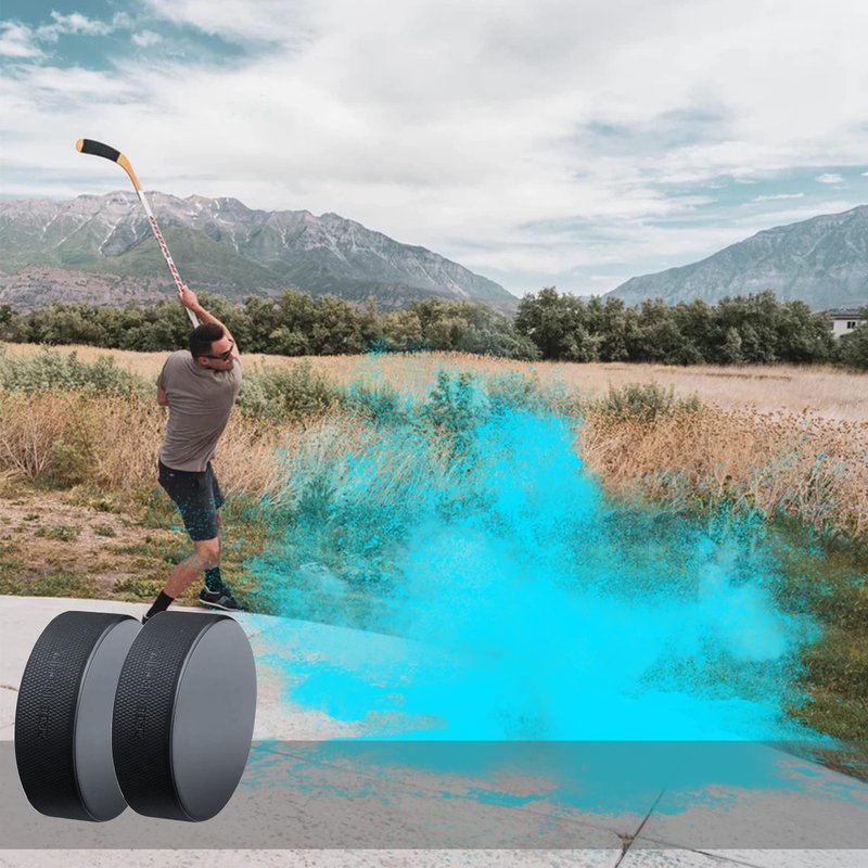 - πβοΈγ SET OF 2 BLUE BOY & PINK GIRL HOCKEY PUCKS γNot one but a two pack of blue baby boy and pink baby girl reveal gender hockey puck kit! When you take that first slap shot and watch the blue or pink powder break from the hockey puck, celebrate by taking the second one and shooting it even harder! These gender reveal sports hockey pucks look like actual ice hockey pucks, and can be used on any surface! The perfect decoration for any gender announcement party!