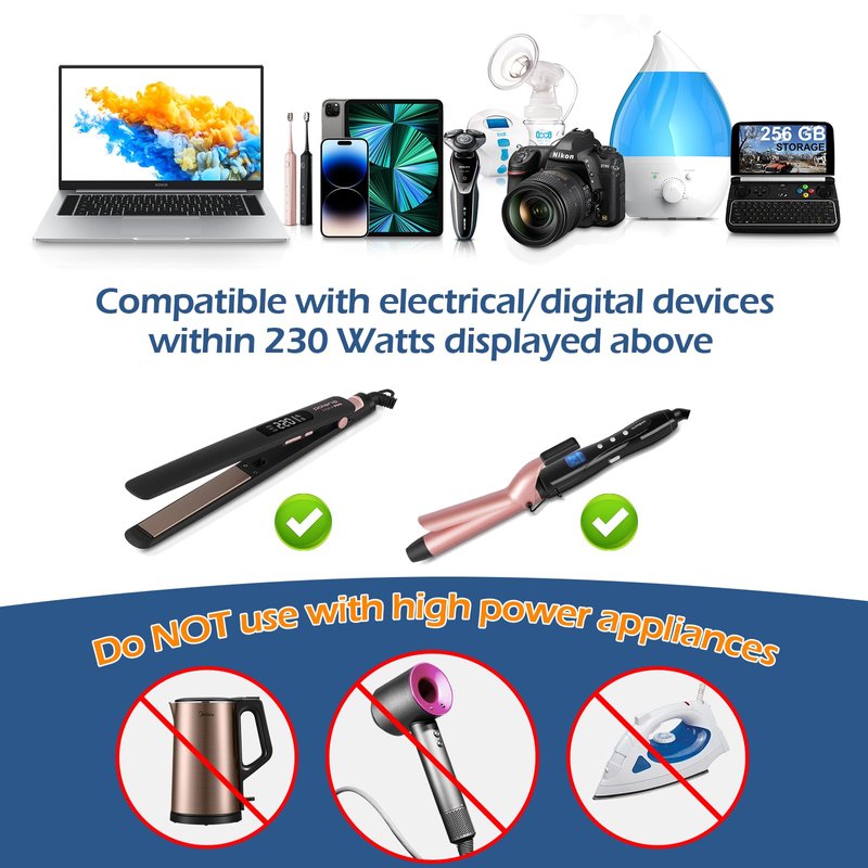 - 【Universal Power converter adapter】Supply max up 230 watts power electric converter for international travel, electrical voltage converter perfect for hair appliances (hair straightener, flat iron, curling iron, hot air brush), and electric shaver/toothbrush, cell phone, camera, watch, laptop, bluetooth speaker, and other electronic devices.