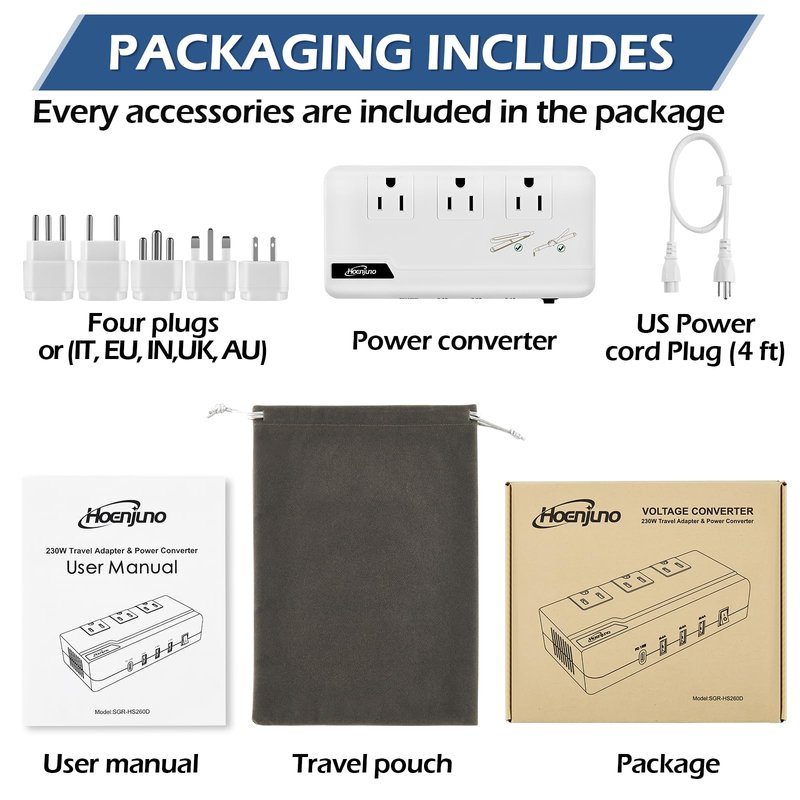 - 【Worldwide Use】1 US power cable and 5 International adapters (UK, EU, AU, IT, IN adapter), step down conv-erter the voltage from 100 - 240V 50/60Hz worldwide to 110 - 120V 60Hz in US Appliance, so you could use American electronics in 220V/ 240V countries such United Kingdom, Continental Europe, Italy, Australia, Thailand, Japan, China,Russia etc, more than 150 countries over the world.