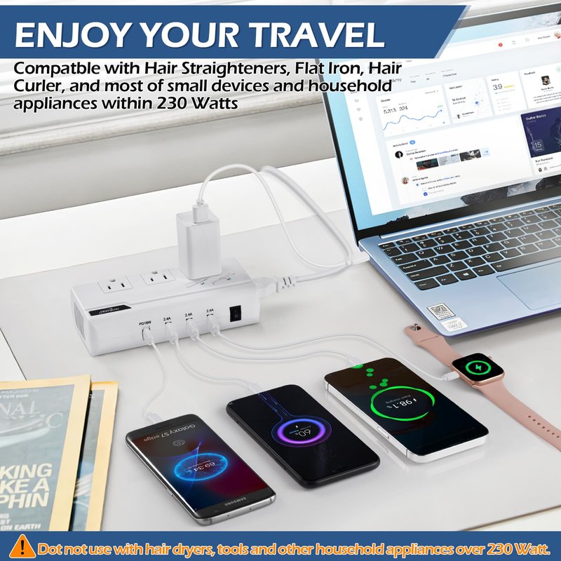 This upgraded version WORKS PERFECTLY for Hair Straightener and Hair Curling Iron,the International Travel Adapter with two standard US plugs and Include 4 USB ports charging one Type C PD18W,it can work with appliances under 230 Watt such as Electrical shaver/hair cutter, Electrical toothbrush, fan, nebulizer, game console, Kindle,Laptop, Mobile phones, etc..