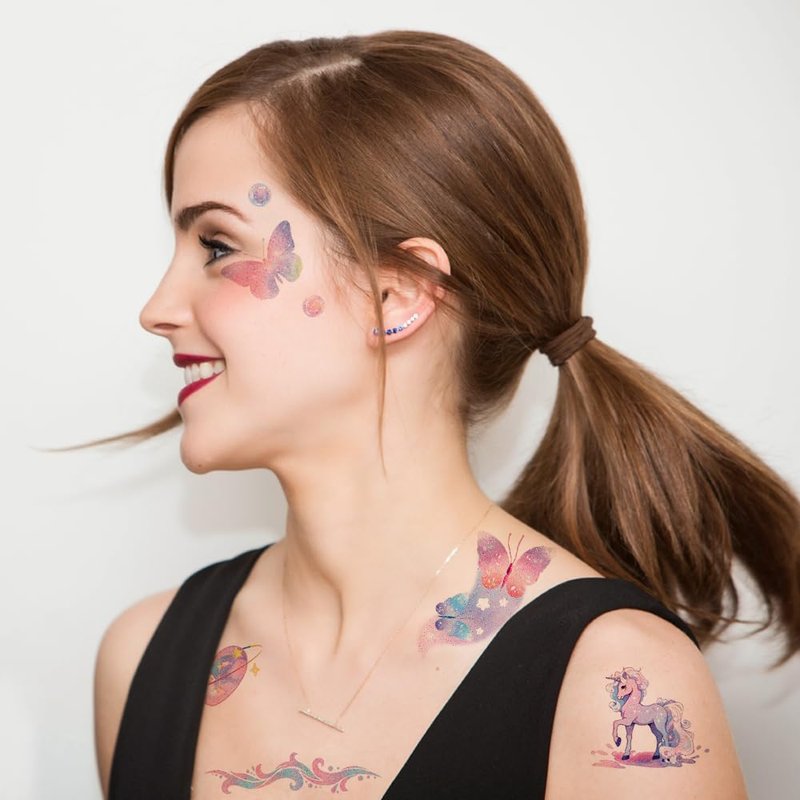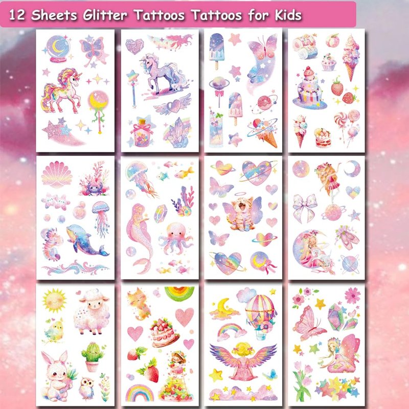 - 🎁【Glitter Themed Tattoos for Girls】Colorful glitter butterfly unicorn ice cream mermaid tattoos for girls, Use them as party favors and your kids will love. Perfect for kids themed party, birthday activities, family gathering and other party events. They will be you and kids' favorite small gifts.