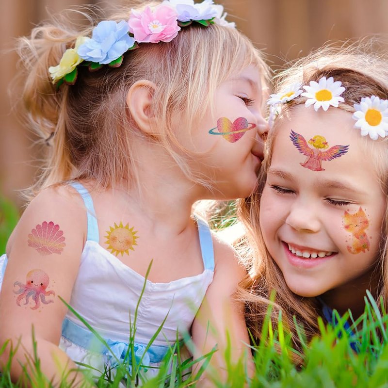 - ❤️【More Safety & Healthy Choice】These glitter kids temporary tattoos are made of high quality safety and green paper, Non-allergenic, Non-toxic and totally safe for your kid's skin. Simply wet the tattoo with water and stick transferred them onto your body, hands, faces and arm you like, Tattoos will last from 3 to 5 days.