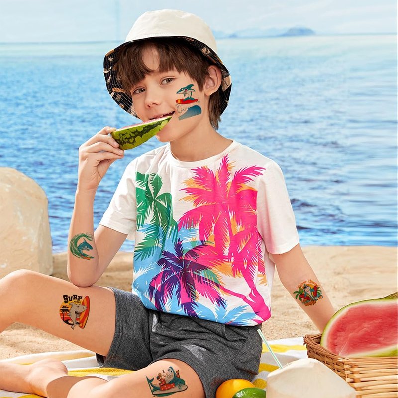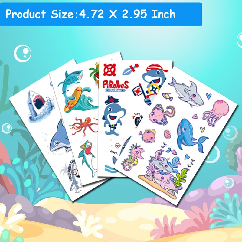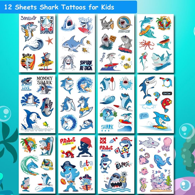 - 🎁【Value Shark Tattoos Party Accessory for Kids】Popular hit with the kids. These shark temporary tattoos are perfect for a party! You can choose the pattern you like and create your own style. Great for birthday party, fruit theme party, children's day party gifts, Halloween, Christmas, classroom rewards, etc. You can apply them to your body or some smooth objects, for example, glass, stationery, paper, crafts cups, cabinet, bottle.