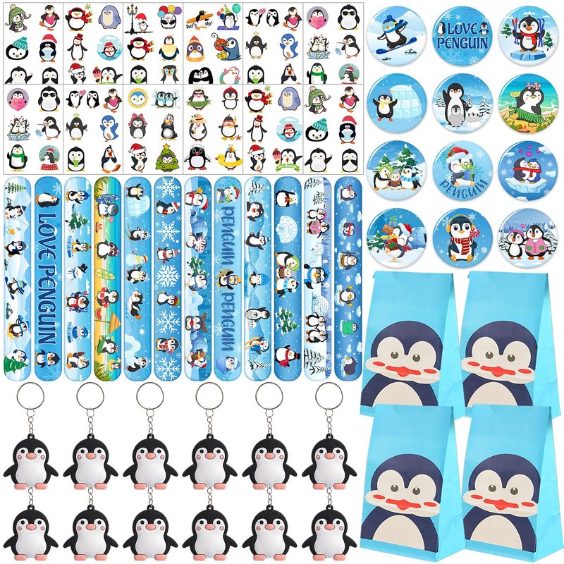 PACKAGE INCLUDE: 12 pcs penguin slap bracelets 12 pcs penguin keychains 12 pcs penguin badges 12 sheet penguin temporary tattoos (8 styles) 12 pcs penguin gift bags UNIQUE DESIGN: Customized penguin party supplies design with various cartoon penguin patterns, which full of charming winter atmosphere. Kids will love it! WIDE APPLICATION: Cute penguin party favors prefect for penguin party, penguin party decorations, penguin birthday decorations, winter party favors, winter themed party decorations, Christmas, Children's Day giveaway, classroom rewards, baby shower.