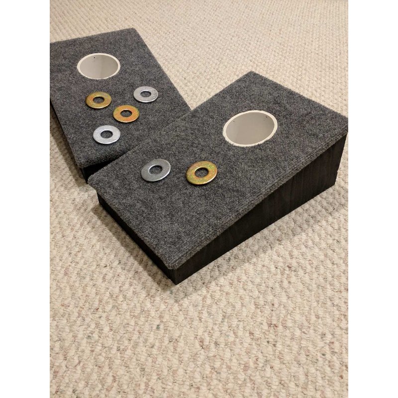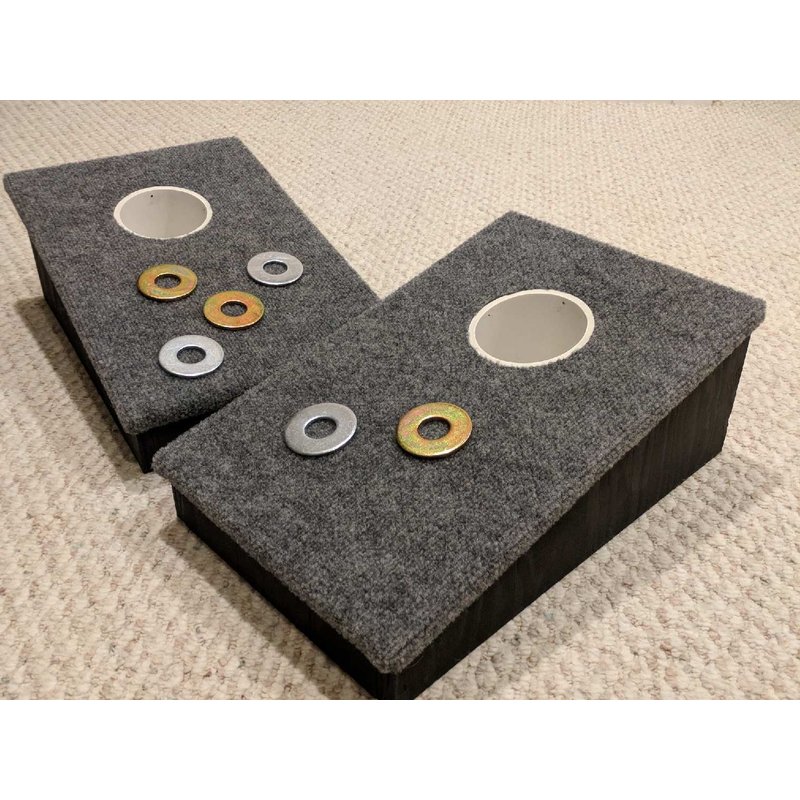 1 Hole Slanted Boards Washer Games uses a top made from 1/2" OSB and covered with indoor / outdoor carpet. Glued and stapled so it will stay securely fastened. The under frame box is made from 3/4 inch plywood and is both glued and nailed for strength. It’s painted for long life. The set measures 12”x18” and has a 4 inch incline. The 4" tubes sit just off the ground so no more lifting the boards to find your washers... 1 - 4” tubes, it comes with six 2 ½” inch washers. Silver zinc and yellow zinc coated washers... nothing to chip or repaint ever!! The proportions of a 4” tube and 2 ½” washer are critical and considered the standard in washer games. Standard rules call for the Game boards to be spaced 20 feet apart.