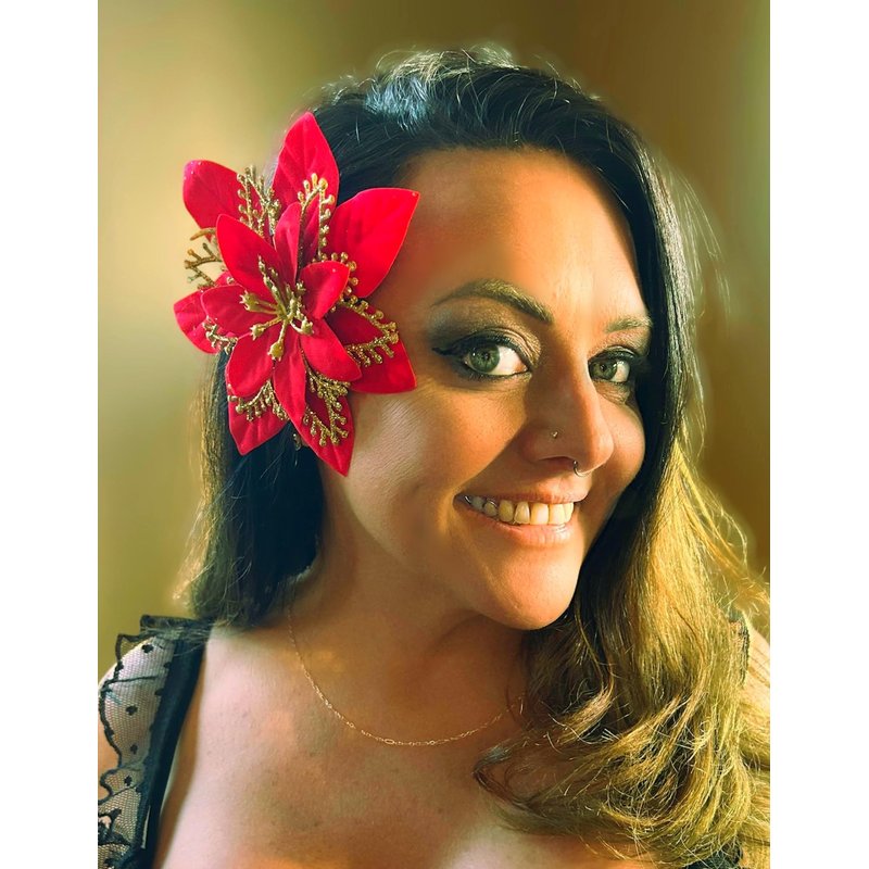 Holiday Red Poinsettia with Gold Glitter Hair Flower Clip and Brooch PIn
