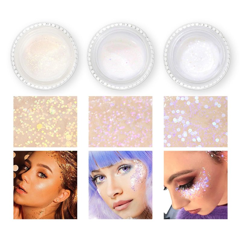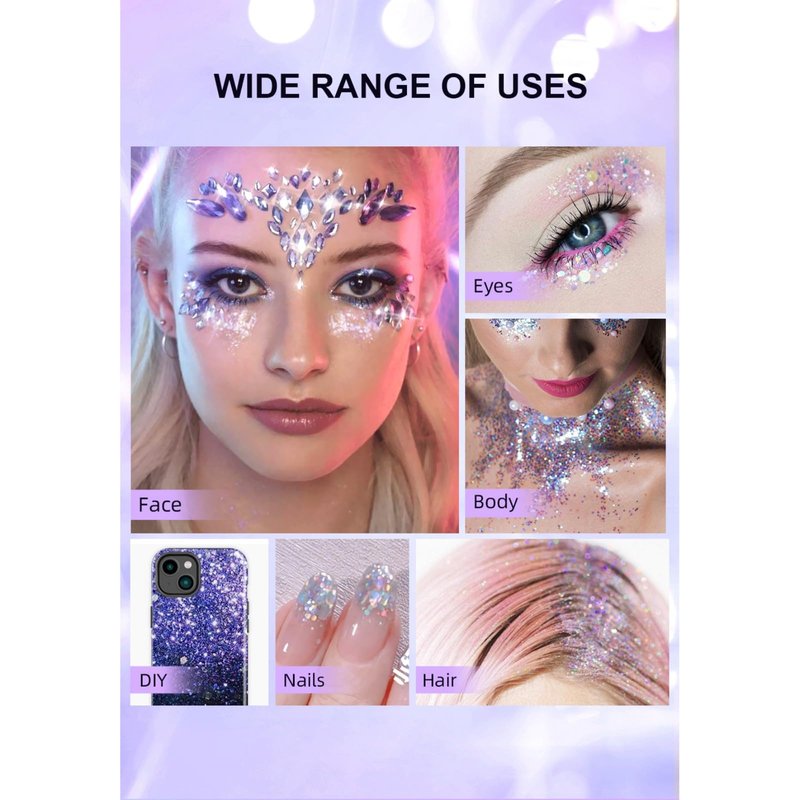 - No Irritation Of The Skin: Are you concerned that Music Festival rave accessories are not a formula mild enough for sensitive skin? Our face glitter gel mixes cosmetic-grade sequins with high-quality gel substrate. It doesn't contain any harmful chemicals, is light in texture, nonirritating, all vegetarian, and non cruel, The ingredients are also safe for children.