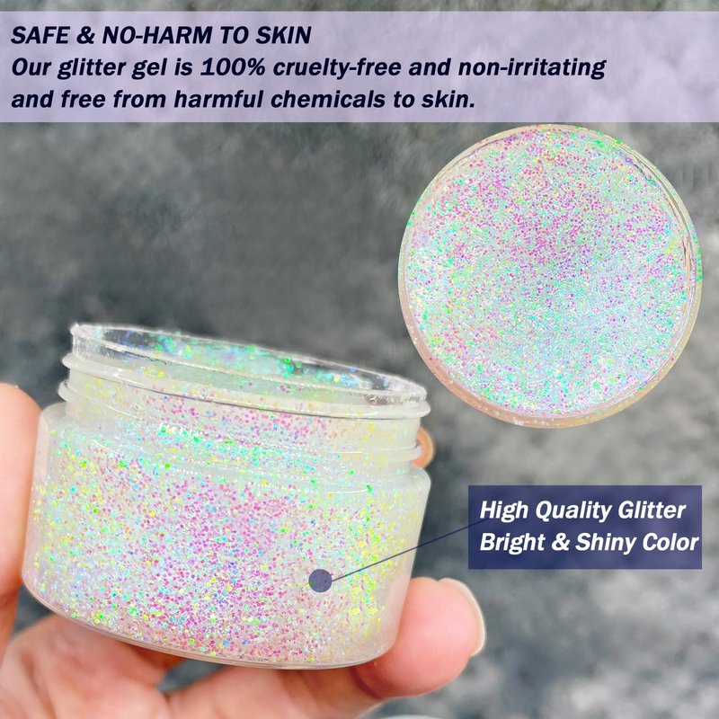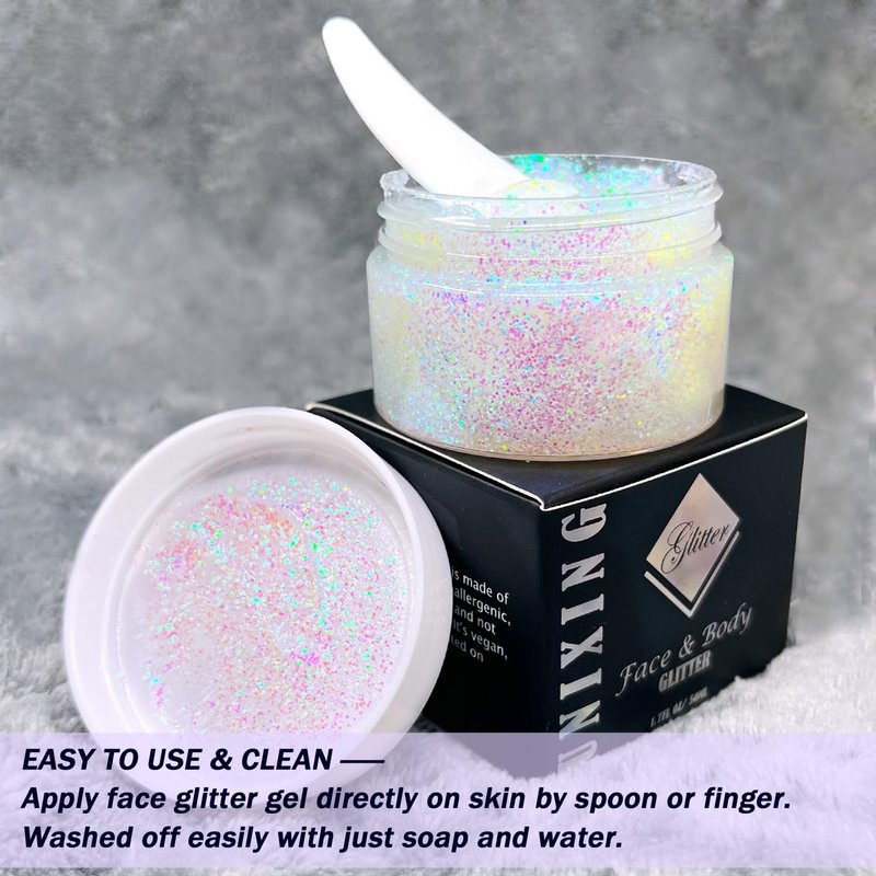 - Cosmetic-Grade Glitter Gel: Unixing holographi face and body glitter gel is made of high-quality, safe and non irritating cosmetic-grade materials. It is Vegan & Cruelty Free. the glitter is bright and color changing under light. Each bottle contains 1.7 Oz/50ml.