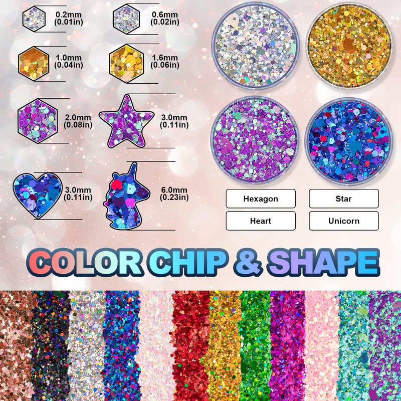 - Holographic Chunky Glitter:the glitters consist of HEXAGON; STAR; HEART and UNICORN. 8 boxes sizes are 0.2mm & 0.6mm & 1mm & 1.6mm & 2mm &3mm & 6mm mixed which perfect for body& Face& Hair make up& nail arts decoration