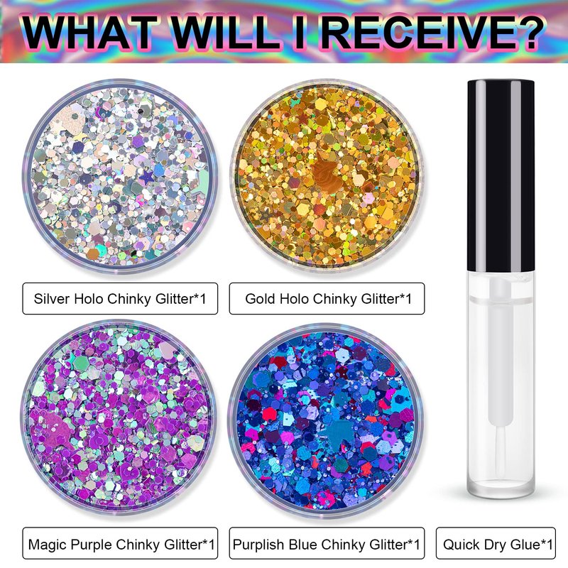Holographic Chunky Glitter Silver Gold Magic Purple and Purplish Blue Cosmetic Body Hair Face Eye for Festival Carnival Beauty Rave Accessories Different Shapes 4 Pots+ Quick Dry Primer Glue Gel