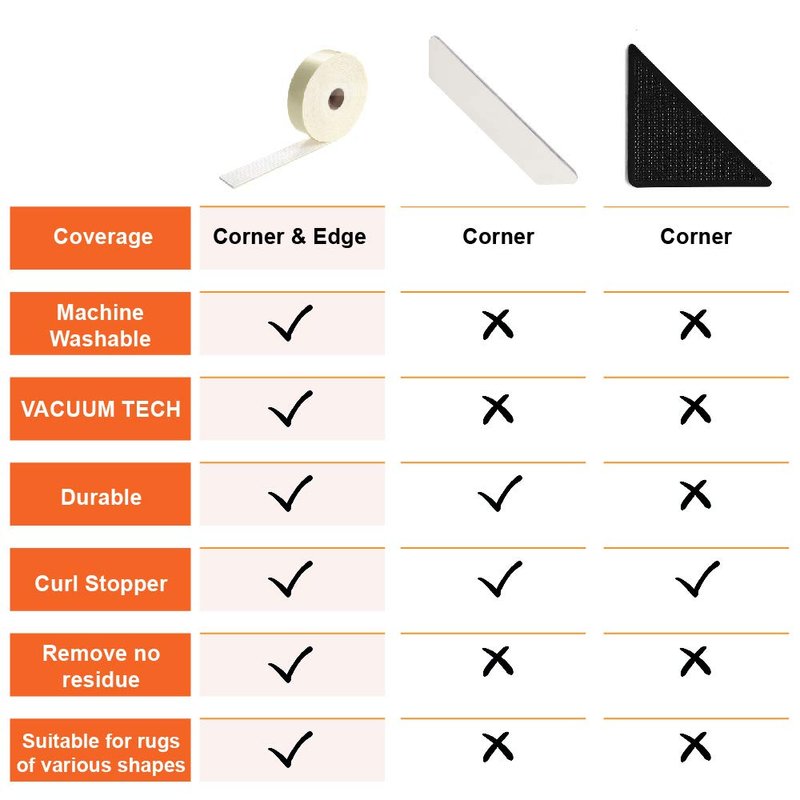 - ★Advantages. The rug anti curling gripper is less than 1/10 inch thick and inconspicuous after installing. Suction technology firmly sticks to the floor without causing marks or damage, and the gripper easily peels off the floor. It is convenient to wash, as you won’t have to separate it from your carpet for cleaning. The rug tape adds extra comfort underfoot owing to the slightly bouncy nature of suction technology.