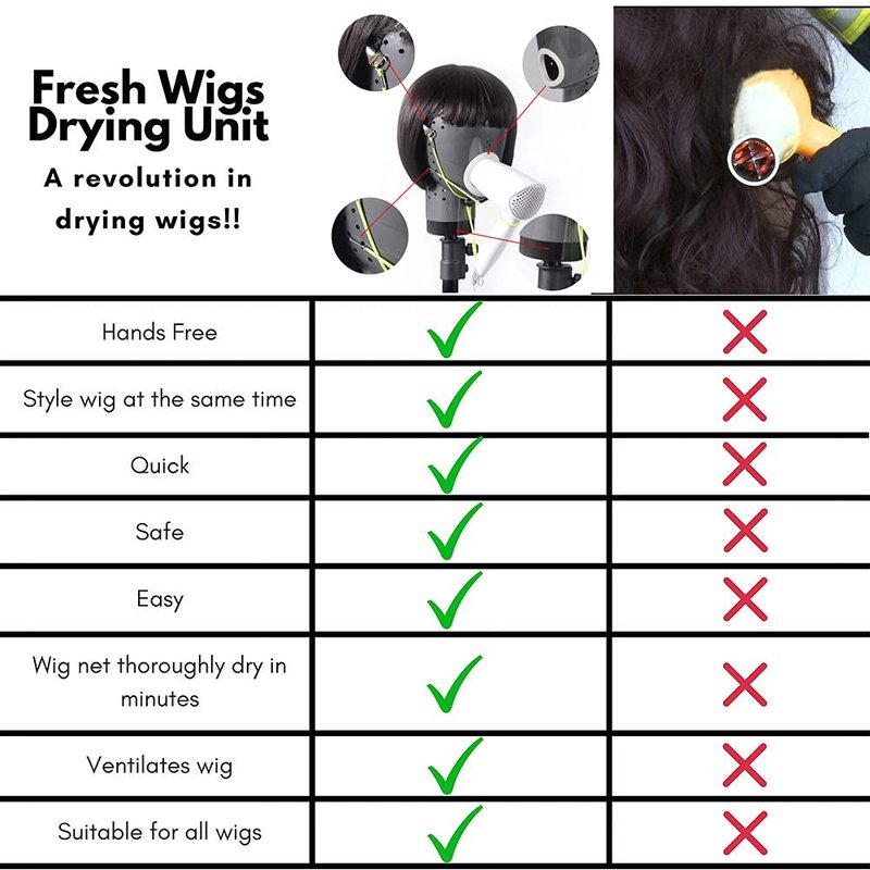 - Safty dryed natural hair and synthetic wigs. Prolong the life of your wig and keep it feeling and smelling clean and fresh - Wigs are expensive and so you must treat them with care. The Fresh Wigs Drying Unit causes no damage to your wigs when drying. Wash and dry your wig and handsfree - allows you to style the wig at the same time as drying.