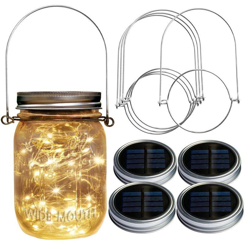 Homeleo Decorative Solar Mason Lights for Any Occasion: * 100% Watertight Mason Jar Firefly Fairy Lights, can be used any occasion both indoors and outdoors * Ideal for weddings, receptions, dinner parties, formal events & BBQ's * These Fiary Lights are also a great way to light up gardens, pathways, ponds, patios, sun rooms, benches, dressers, tables, bookshelves & window sills * With these wide mouth mason jar lights, you could make full use of your mason jar to DIY the beautiful garden decor, deck decor, patio decor etc. * Just DIY Your Own Garden Deck Decor Light with Homeleo Wide Mouth Solar Mason Jar LED String Light Specifications: * Material: Plastic * LED Quantity: 20 LEDs * LED Light Color: Warm White * Solar Panel: 2V, 70mA * Battery: AAA, 1.2V, 300mA * Light Modes: Steady(No Flash) * Diameter: Lid 3.37""(85mm)/Insert 2.17""(55mm)(for Wide Mouth Mason Jar) * Waterproof Rate: 100% Waterproof when tightening on the mason jars * Power source: solar charging Warm Tips: * Please keep the switch on and tear the protective films off BEFORE you put the solar panel under the sunlight to get charged * Please keep the surface of solar panels clean, or the dust will affect the efficient of charging * As the charging effect of the solar panel is depend on the sunlight, the LED light time & brightness are affected by weather, seasons, places, etc * These Solar mason jars lid lights are updated version, 100% waterproof, just tighten the lid on the jars Package Includes: 4 x Homeleo Warm White Waterproof Solar Lid Light Insert for Wide Mouth Mason Jar(Manson Jars Not Included) 4 x Homeleo Stainless Steel Hangers