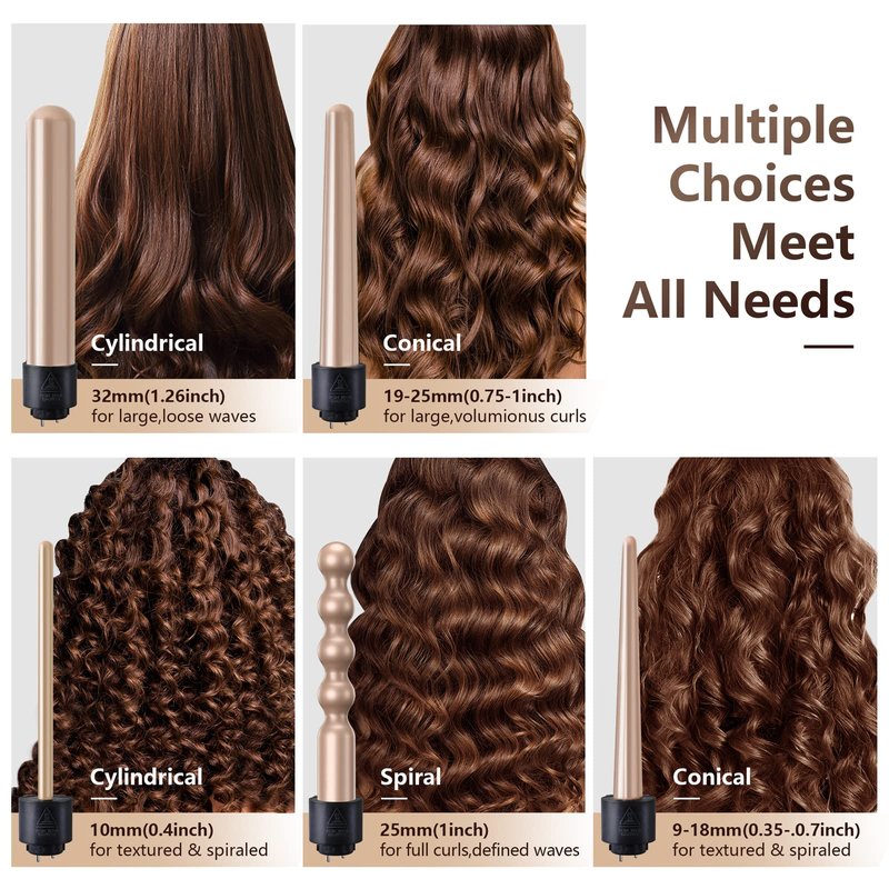 Professional 5 in 1 Curling Wand Set : Hair curling iron set includes 5 interchanable barrels in different sizes ( 1X tapered 0.35-0.7 inch, 1X tapered 0.75-1 inch, 1X 1 inch spiral barrel , 1X large barrel curling iron 1.25 inch ,1X small curling iron 0.4 inch ) which allows to DIY all curl waves as you like
