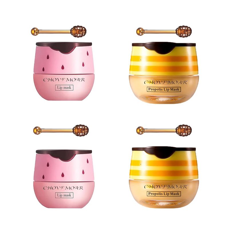 Honey Lip Balm Pot, Propolis Lip Mask, Strawberry Hydrating Propolis Lip Sleeping Mask, Prevent Dry&Cracked, Lip Repair Nourishes the Lip Skin (2pcs Honey & 2pcs Strawberry)