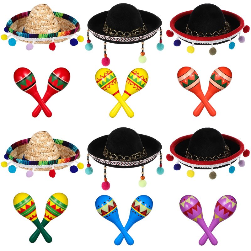 Honoson Wooden Fiesta Maracas Mini Sombrero Top Hat for Kids Festival Mexican Party Decorations (Stylish Style, 18 Pcs)