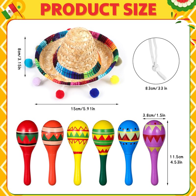- Size Information: the size of this wooden maraca is about 4.53 x 1.5 inches / 11.5 x 3.8 cm, the right size that you can carry to where you want; The sombrero party hats are about 15 x 8 cm / 5.91 x 3.15 inches, the rope length of the hat is 33 inches, such a size design so that most people can wear them, very practical and convenient