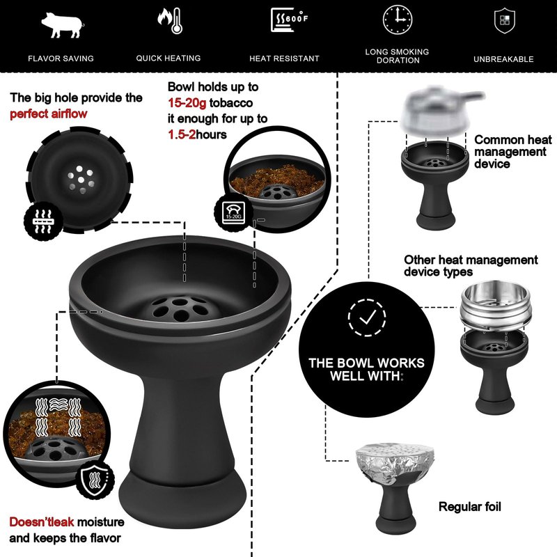 - FAST LAUNCH: The silicone bowl heats up twice fast than other bowls and uses a lot less coals and Shisha